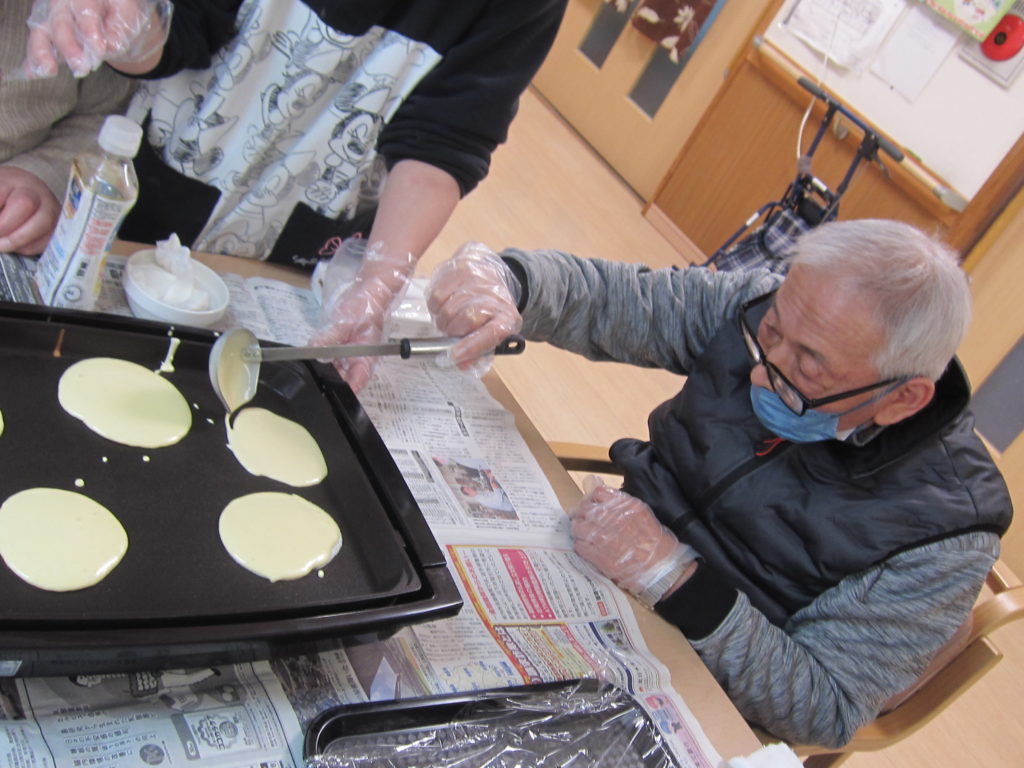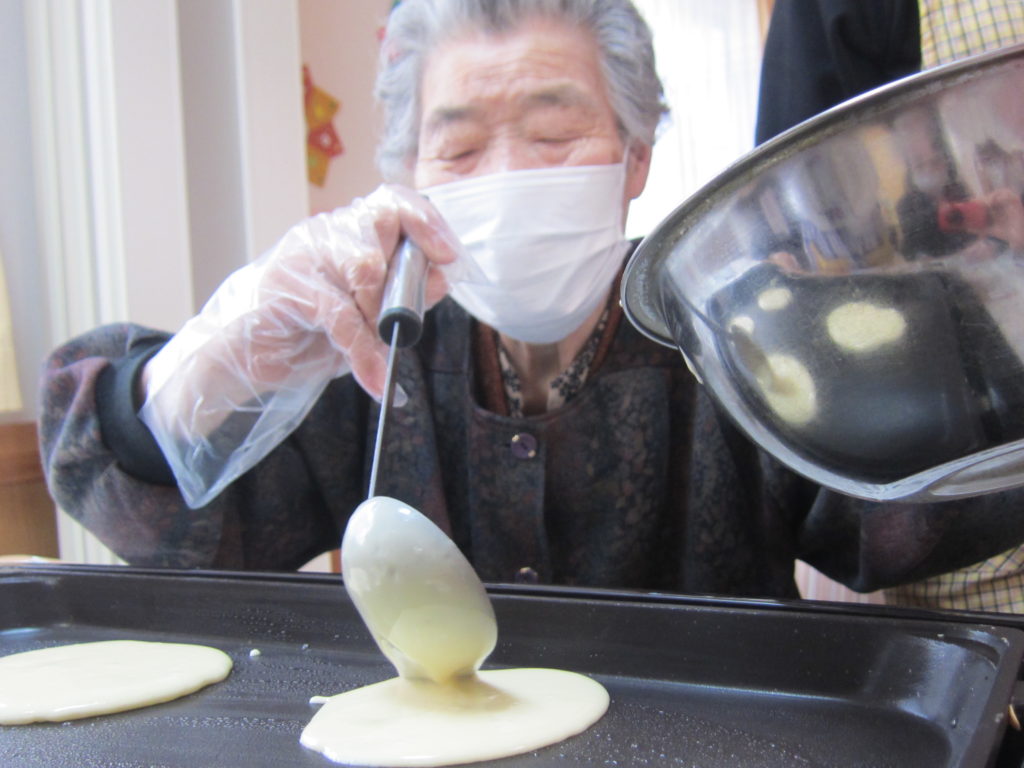 真剣な表情で生地を焼くN様。とてもきれいな丸です。