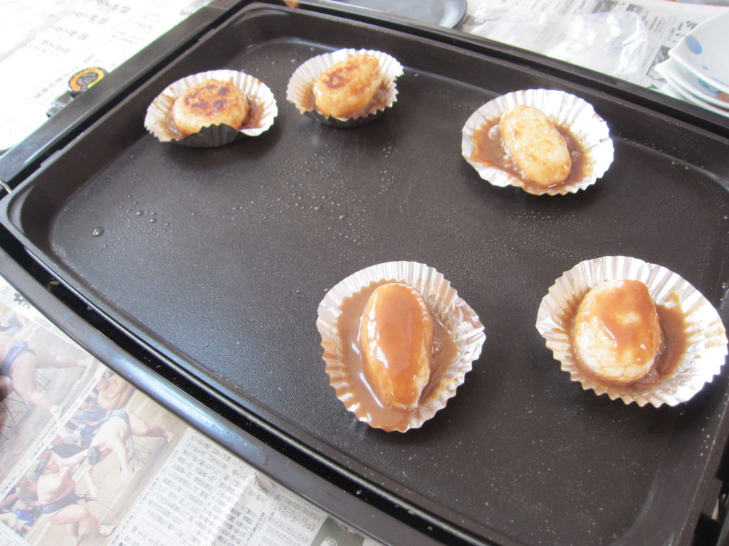 ふきのとうでは、炊き立てのお米をしっかり潰して餅のような状態にし、形を整え、たれをつけて焼きあげました!